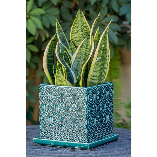 6 in. Finley Small Ceramic Planter (6 in. D x 7 in. H) with Attached Saucer Blue Decorative Pot