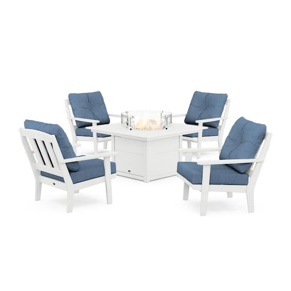 Cape Cod 5-Pieces Plastic Patio Fire Pit Deep Seating Set in Classic White with Sky Blue Cushions