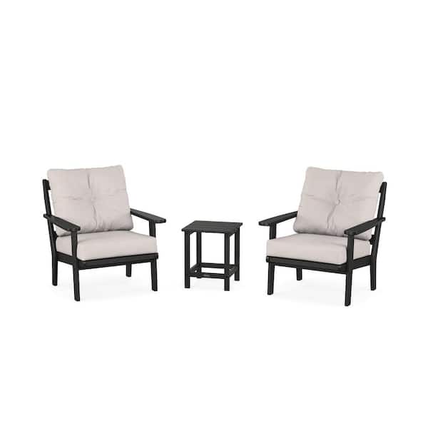 Cape Cod Charcoal Black 3-Piece Plastic Patio Conversation Set in Dune Burlap Cushions