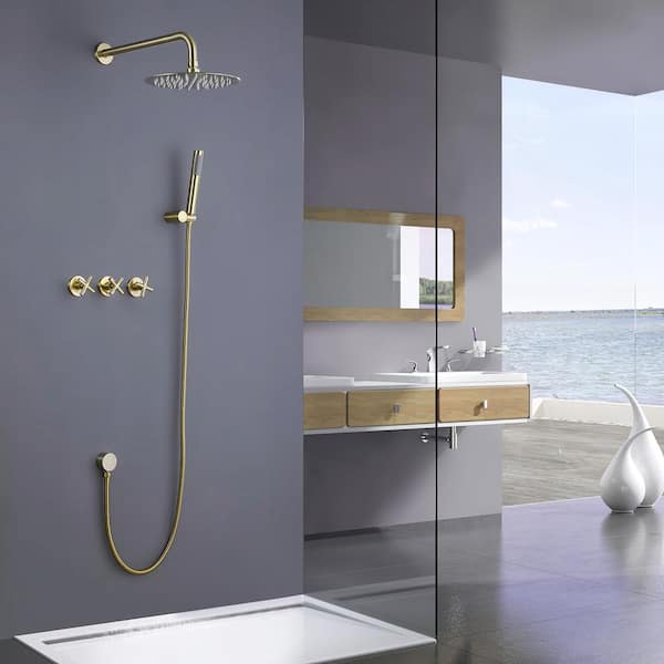 Triple Handle 1-Spray Round Shower Faucet 2.9 GPM with High Pressure in Brushed Gold (Valve Included)