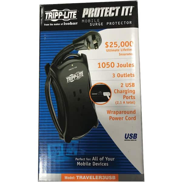 Protect It 3-Outlet AC Power Outlet Travel Size Surge Protector with 2 USB Charging Ports