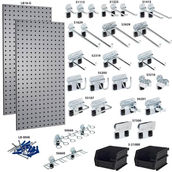 (2) 18 in. W x 36 in. H Gray Steel Square Hole Pegboards with 30-piece LocHook Assortment and Hanging Bin System