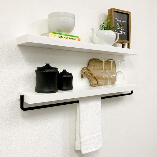 True Floating 5.5 in. x 36 in. White Pine Wood Floating Decorative Wall Shelf and Towel Bar Set with Brackets