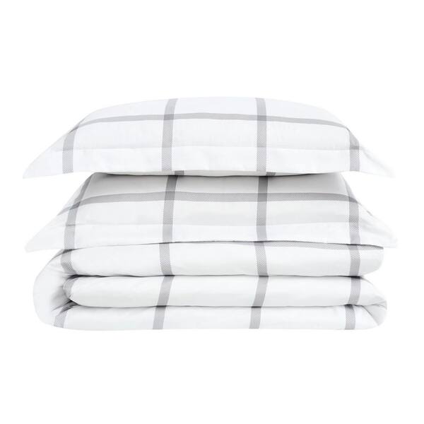 Printed Windowpane 3-Piece White/Grey Microfiber Full/Queen Duvet Set