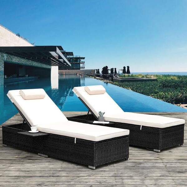 2-Piece Wicker Outdoor Patio Chaise Adjustable Backrest Lounge Chair Sets with White Cushions Dark Coffee Frame
