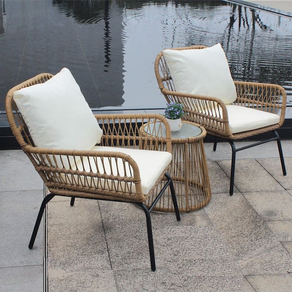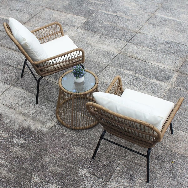 3-Piece Outdoor Wicker Steel Patio Balcony Chair Set with Beige Cushion Round Glass Table