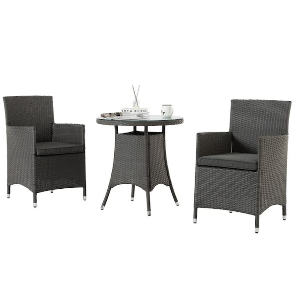 3-Piece Wicker Round Tempered Glass Tabletop Outdoor Dining Set with Grey Cushions