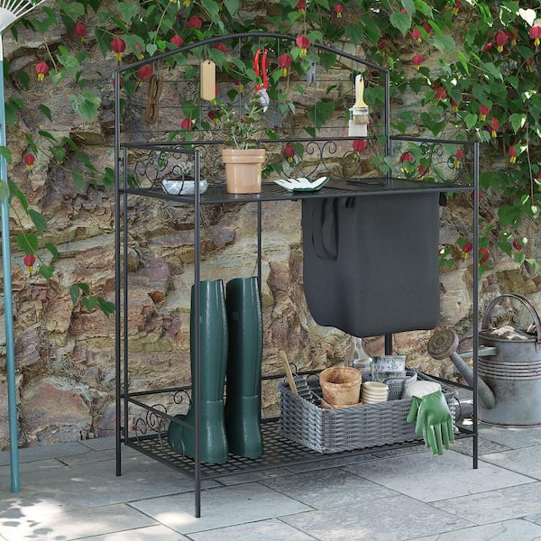 33.5 in. x 17 in. x 47.25 in. Black Potting Utility Garden Table with Built-In Dirt Bag and 5-Hanging Tool Hooks