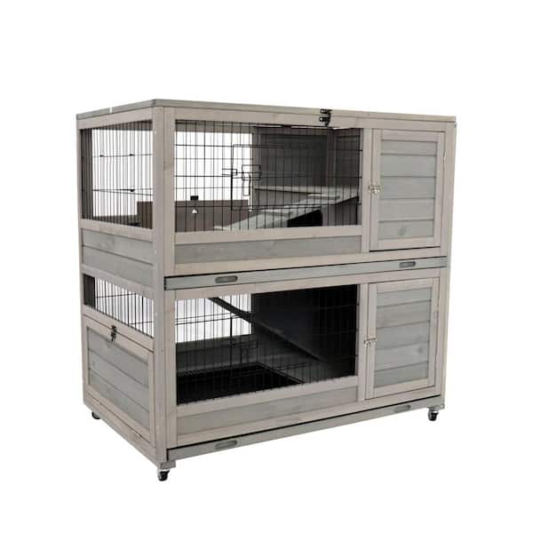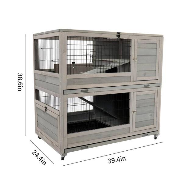 38.6 in. W x 39.4 in. D x 24.4 in. H Double Rabbit Cage Spacious Multi-Area Wooden Outdoor Guinea Pig Cage, Gray