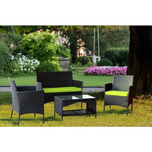 4-Piece Black Wicker Outdoor Sectional Set with Green Cushions for Garden
