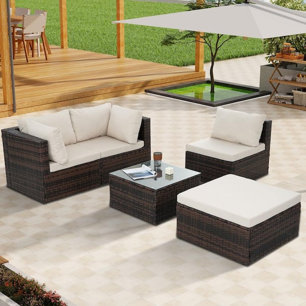 5-Piece PE Wicker Outdoor Patio Conversation Furniture Set with Tempered Glass Table and Beige Seat and Back Cushions