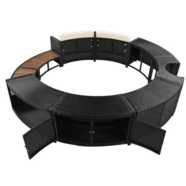 9-Piece Black Wicker Outdoor Sectional Sofa Set with Beige Cushions, Storage Cabinet, Spa Enclosure