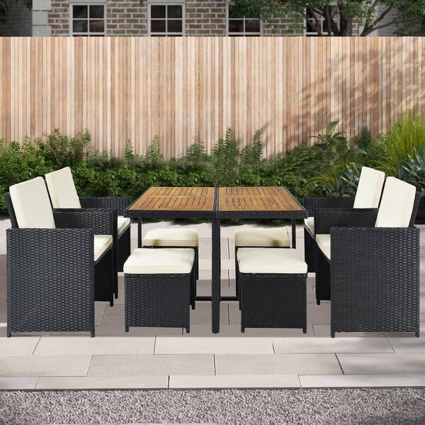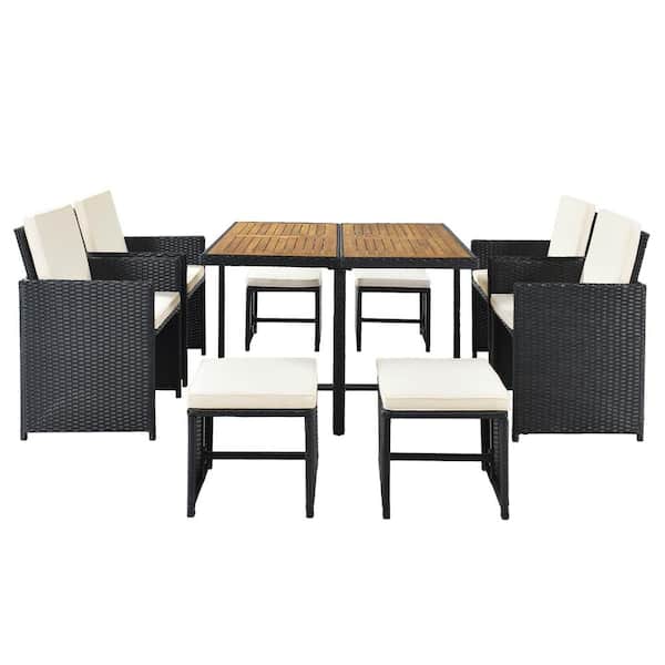 Black 9-Piece Wicker All-Weather Outdoor Dining Set Wooden Tabletop with Beige Cushions