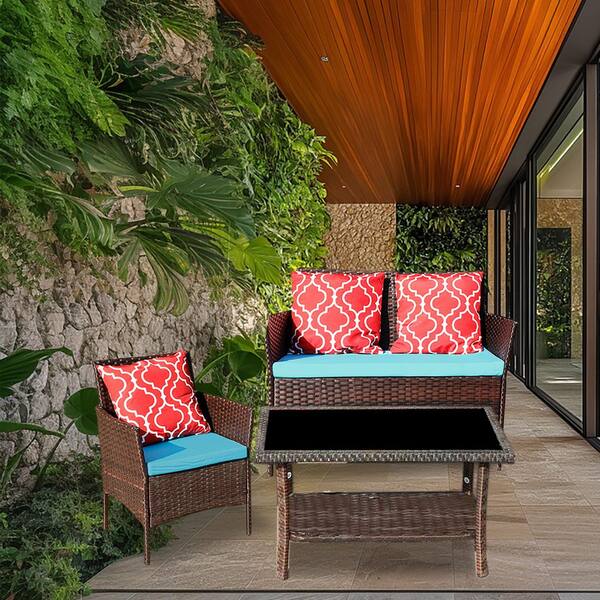 Brown Wicker Outdoor 4-Piece Sectional Set with Emerald Green Cushions Checkered Pillows and Table
