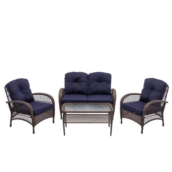 Modern 4-Pieces Wicker Steel Outdoor Furniture Patio Conversation Set with Navy Blue Cushion Rectangular Glass Table