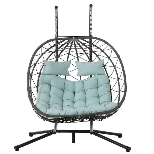 Outdoor Garden 2 Person Wicker Swing Chair Outdoor Rocking Chair Foldable Hanging Egg Chair with Stand and Green Cushion