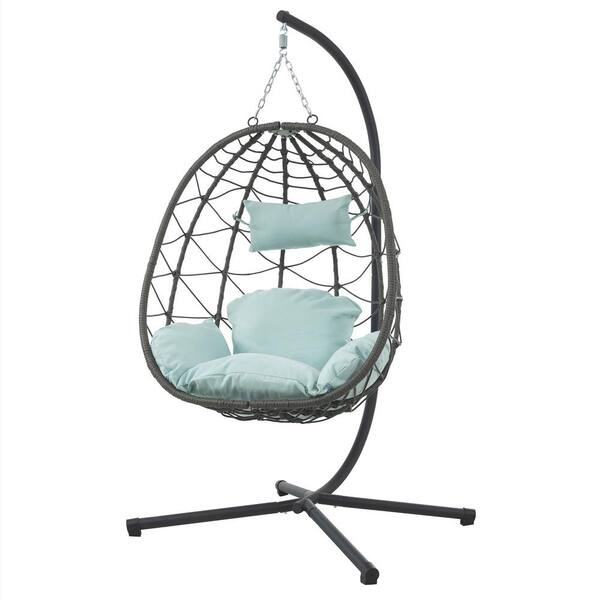 Outdoor Garden Wicker Swing Chair Outdoor Rocking Chair Foldable Hanging Egg Chair with Stand and Green Cushion