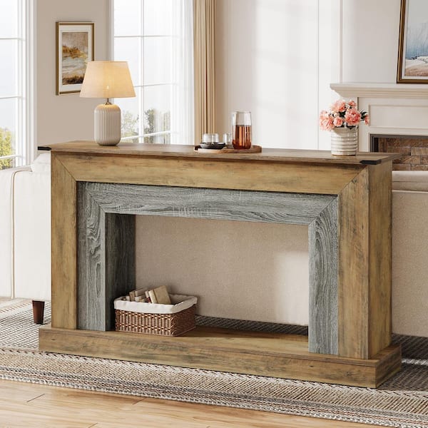 Turrella 63 in. Brown and Grey Rectangle Wood Console Table, 2-Tier Sofa Table Behind the Couch, Narrow Entryway Console