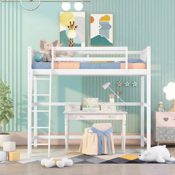 Twin Size High Loft Bed with Ladder for Kids Bedroom, Solid Wood Bed Frame with Guardrails, Space Saving Design, White