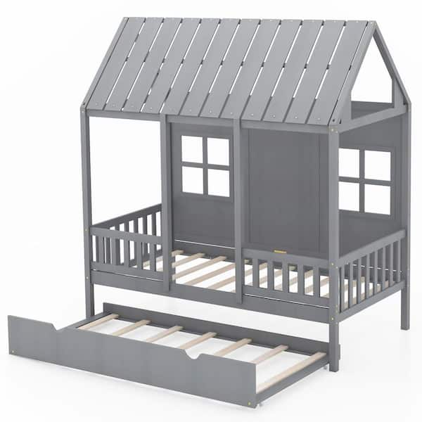 Twin Size House Bed with Trundle Fence Decor Wooden Windows Tall Roof Gray