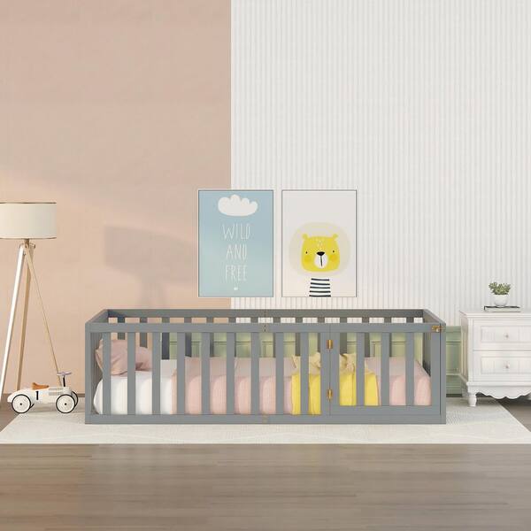Twin Size Wood Daybed Frame with Fence, Twin Floor Bed with Door for Toddlers Kids, Box Spring Needed, Gray