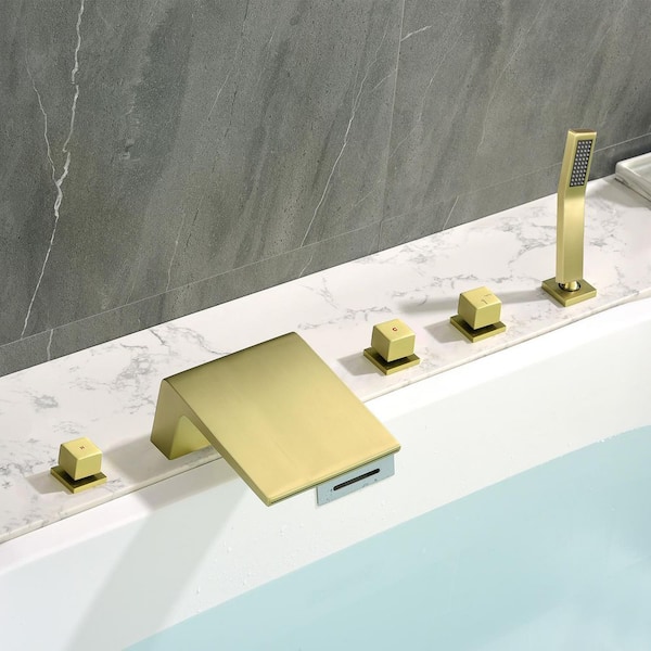 3-Handle Deck-Mount Roman Tub Faucet with Hand Shower in Brushed Gold