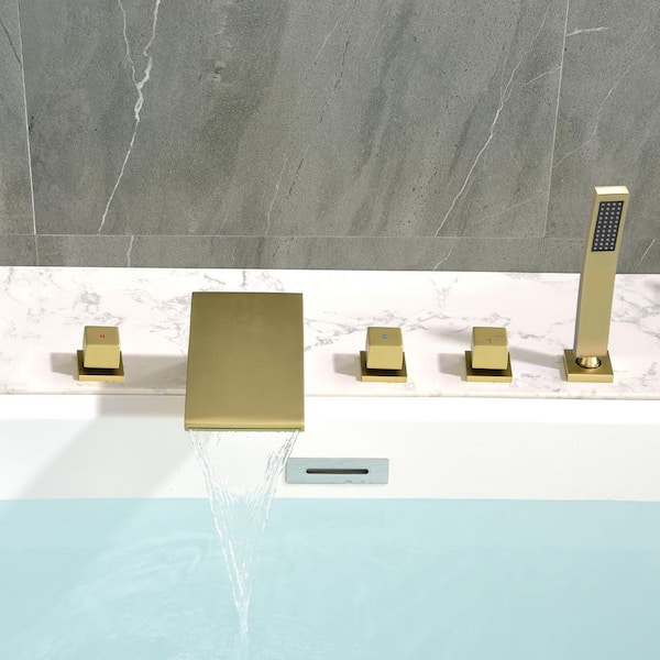 3-Handle Deck-Mount Roman Tub Faucet with Hand Shower in Brushed Gold