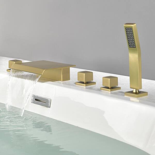 3-Handle Deck-Mount Roman Tub Faucet with Hand Shower in Brushed Gold