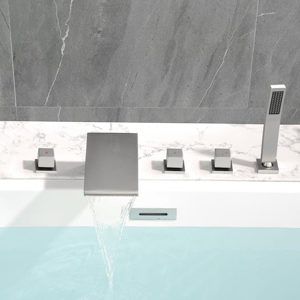 3-Handle Deck-Mount Roman Tub Faucet with Hand Shower in Brushed Nickel