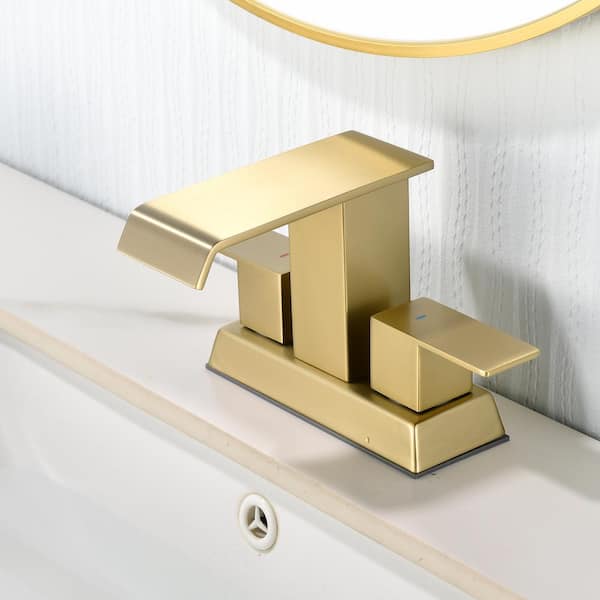 4 in. Centerset 2-Handle Bathroom Waterfall Faucet with Pop Up Drain Kit in Brushed Gold
