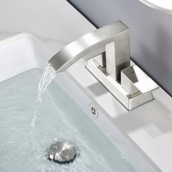 4 in. Centerset Double Handle Waterfall Spout Bathroom Faucet with Pop Up Drain Kit in Brushed Nickel