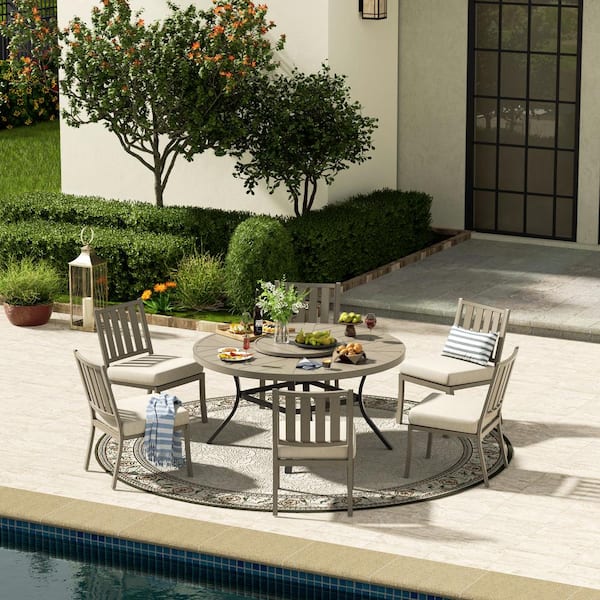 7-Piece Aluminum Outdoor Dining Set with Echo Dune Sunbrella Cushions, Round Dining Table, 6-Dining Chairs