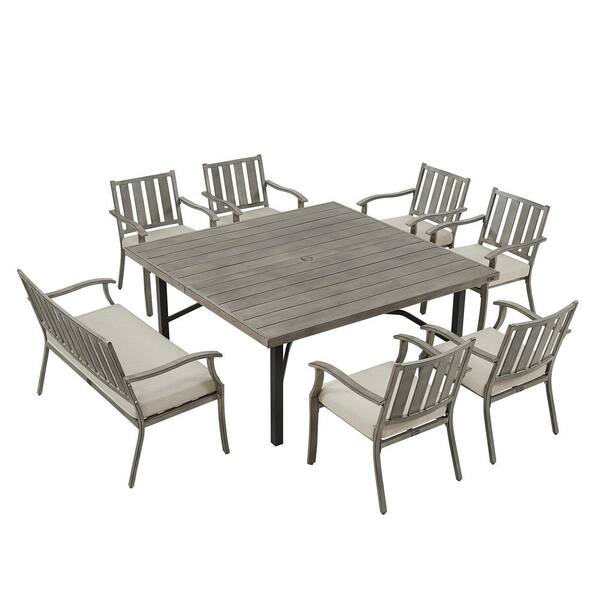 • Patio set includes 6 dining chairs, 1 bench and a square table