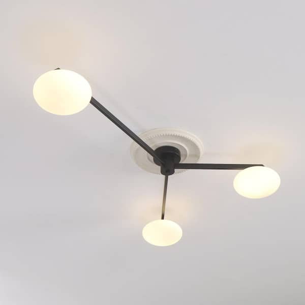55 In. 3-Light Black Modern Branch Glass Semi-Flush Mount for Dining Room Bedroom, with White Glass Shade