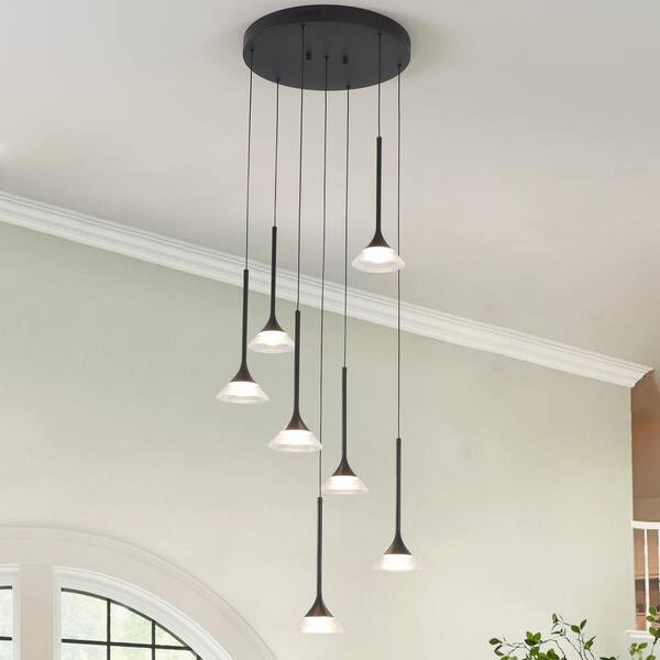 7 Lights Integrated LED Dimmable Black Chandelier for Living Dining Room Stairs,3000K Warm Light,D15.7"*H105"