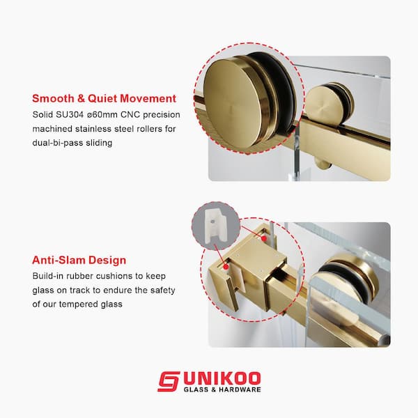 UKD01 56 to 60 in. W x 80 in. H Double Sliding Frameless Shower Door in Satin Brass, EnduroShield 3/8 in. Clear Glass