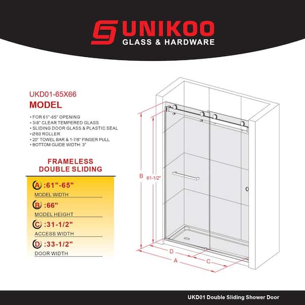 UKD01 61 to 65 in. W x 66 in. H Frameless Double Sliding Bathtub Door in Chrome with EnduroShield 3/8 in. Clear Glass