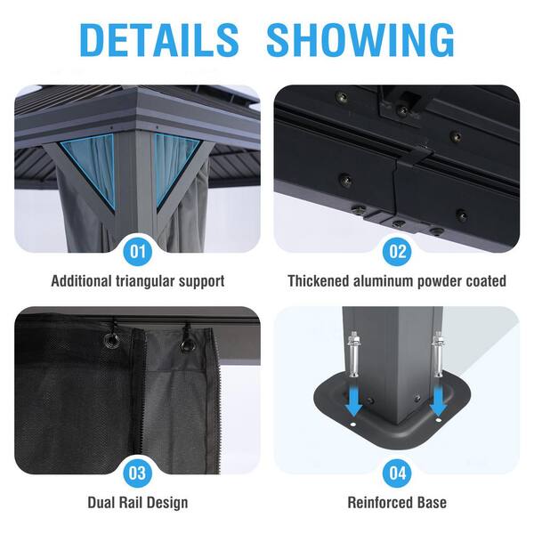 12 ft. x 16 ft. Light Gray Aluminum Hardtop Gazebo with Double Roof Canopy, Gray Curtains and Netting