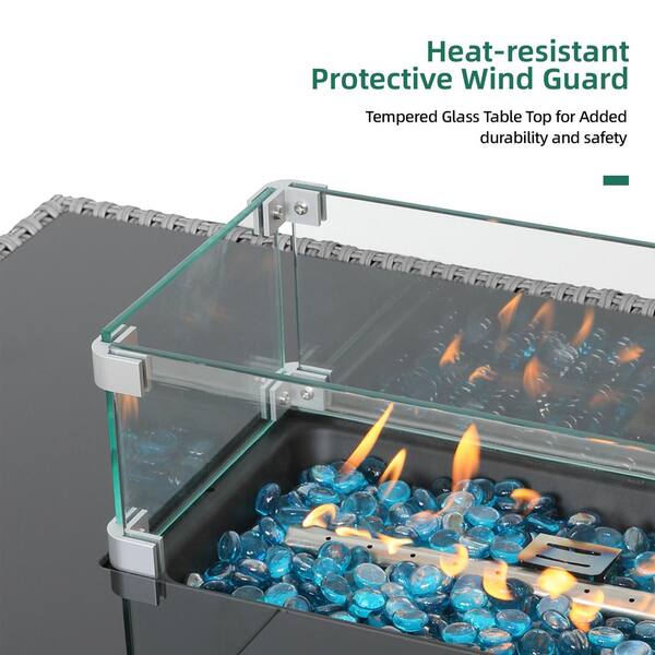 10-Piece Wicker Patio Conversation Set with 50,000 BTU Wicker Firepit Table, Swivel Chairs and Light Gray Cushions