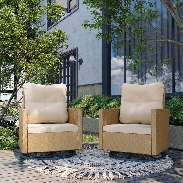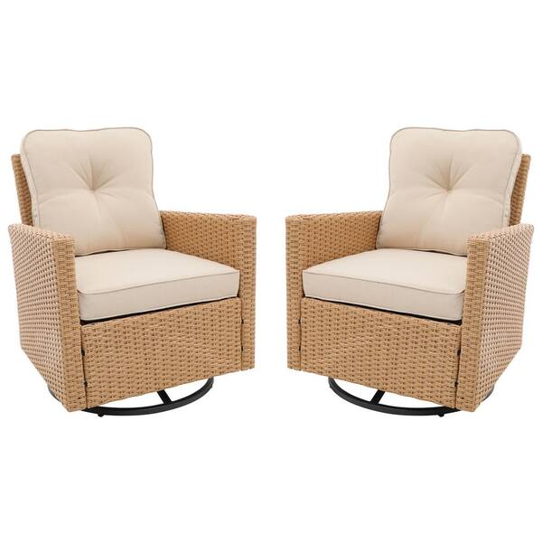 2-Piece Wicker Outdoor Rocking Chair Patio Swivel Chair with Beige Cushions