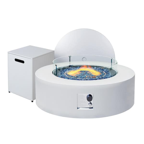 42 in. Outdoor Round Iron White Fire Pit Table with Propane Tank Holder and Glass Wind Guard
