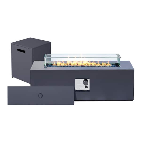 42 in. Rectangular Iron Outdoor Dark Gray Fire Pit Table with Propane Tank Holder and Glass Wind Guard