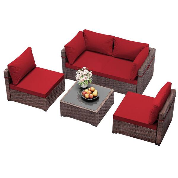 5-Piece Wicker Patio Conversation Sectional Seating Set with Red Cushions