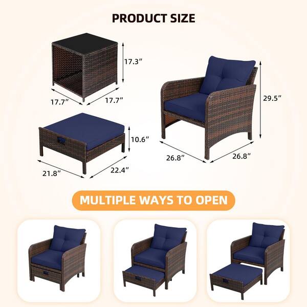 5-Piece Wicker Patio Conversation Set, Outdoor Chairs with Navy Blue Cushions, Coffee Table and Ottomans