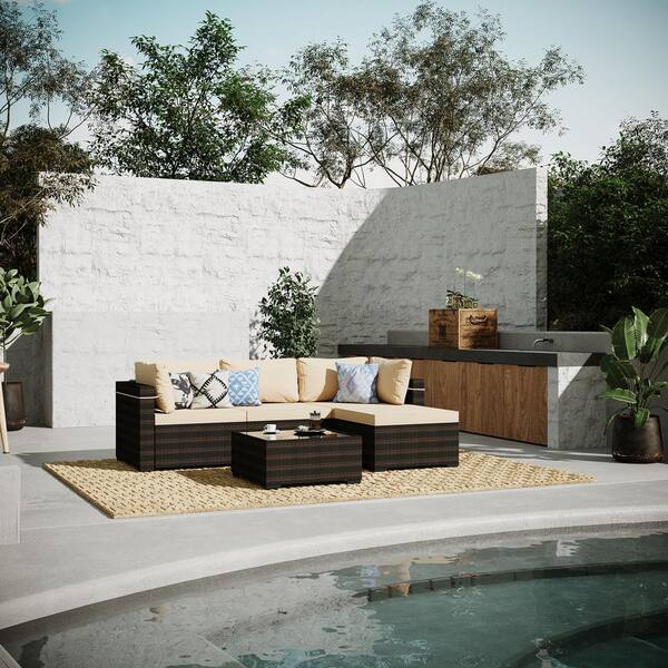 5-Pieces Patio Furniture Set, Outdoor Wicker Conversation Set with Coffee Table and Ottoman for Backyard, Garden, Beige