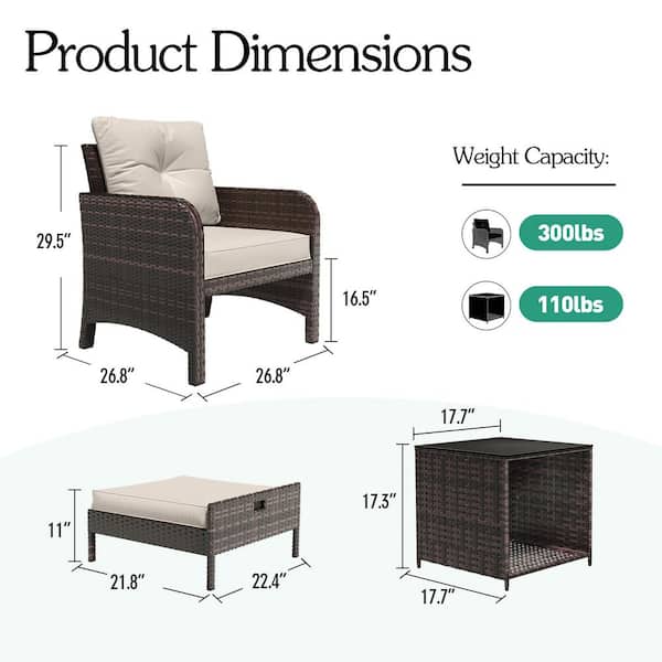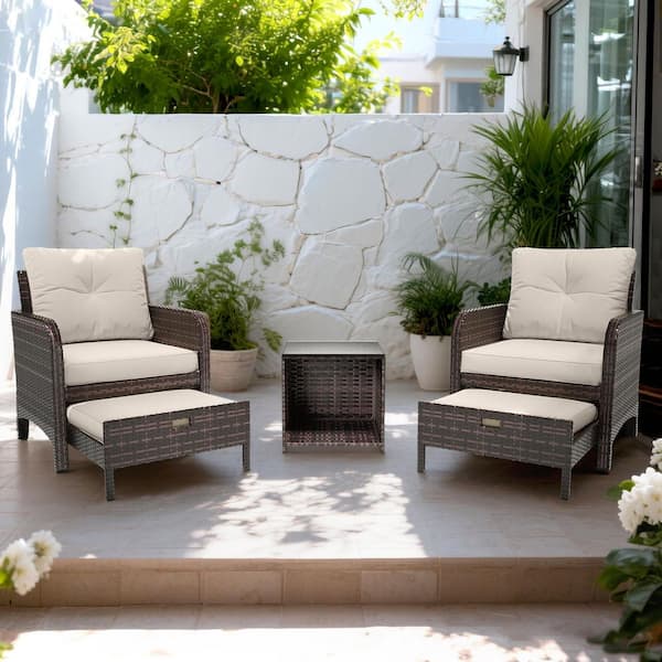 5-Pieces Wicker Patio Furniture Set, Outdoor Chairs with Ottomans, Beige Cushions