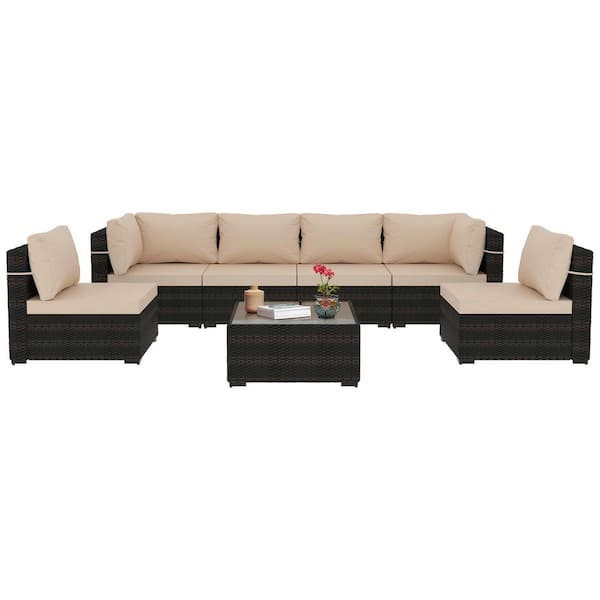 7-Piece Wicker Patio Conversation Sectional Seating Set with Beige Cushions