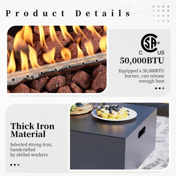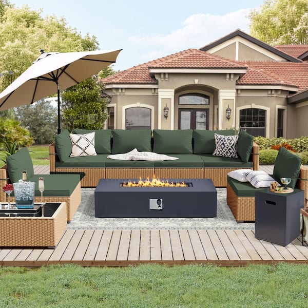 9-Piece Outdoor Yellow Rattan Seating Set with Pine Green Cushions, a 56 in. Dark Grey Rectangle Fire Pit and Tank Cover