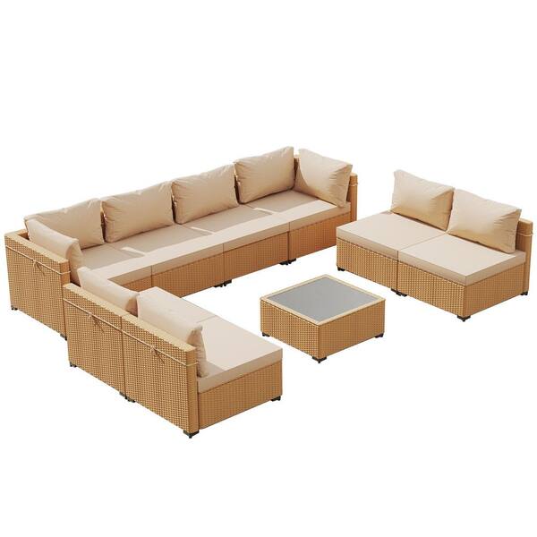 Yellow 9-Piece Wicker Patio Conversation Sofa Set with Beige Cushions