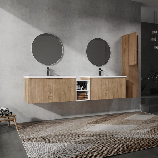 Geneva 82.9 in. W x 18.1 in. D x 19.3 in. H Floating Bath Vanity in Imitative Oak with White Resin Vanity Top